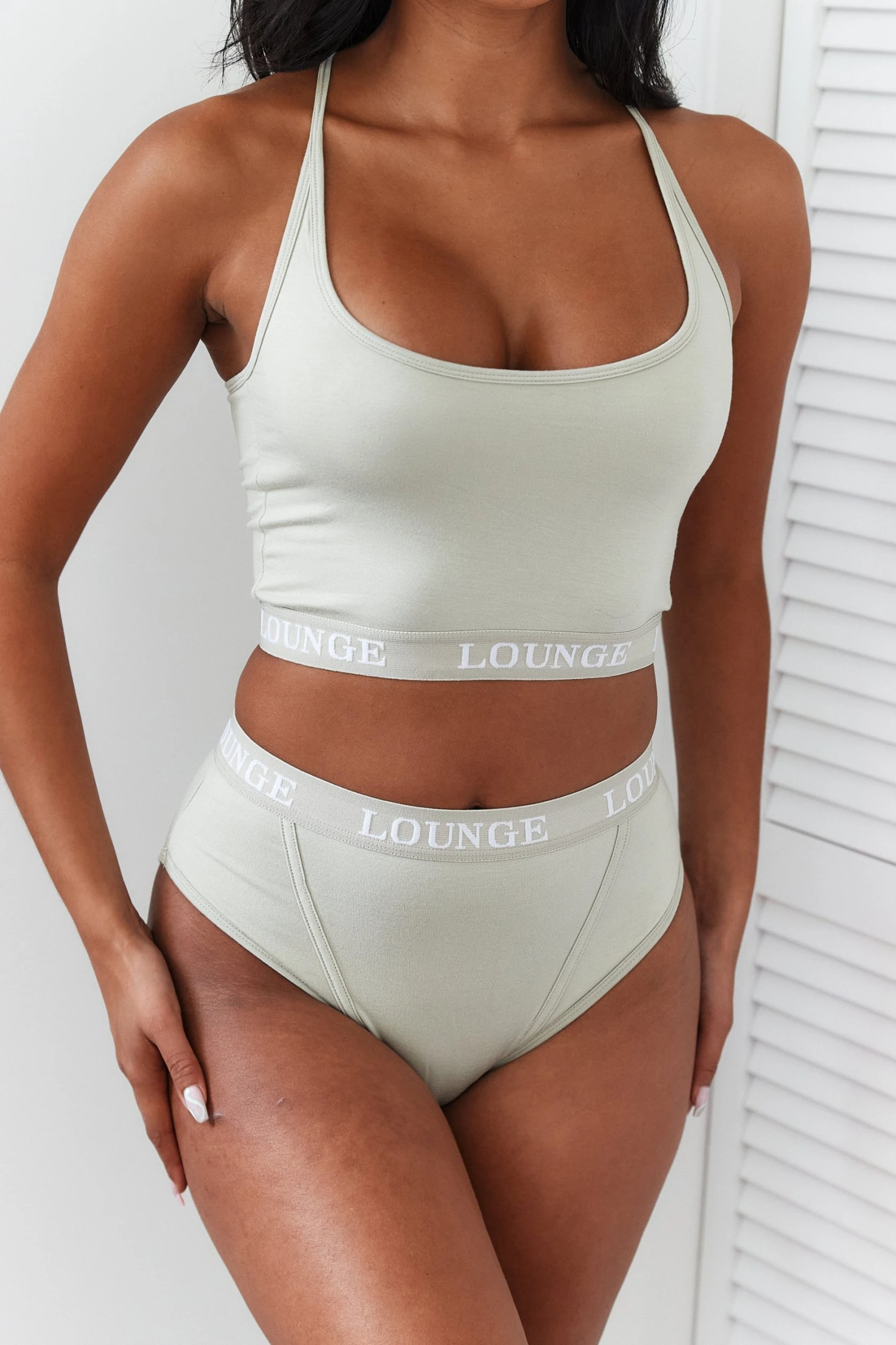 - Matching bra and briefs set with a high waisted boxer-fit style